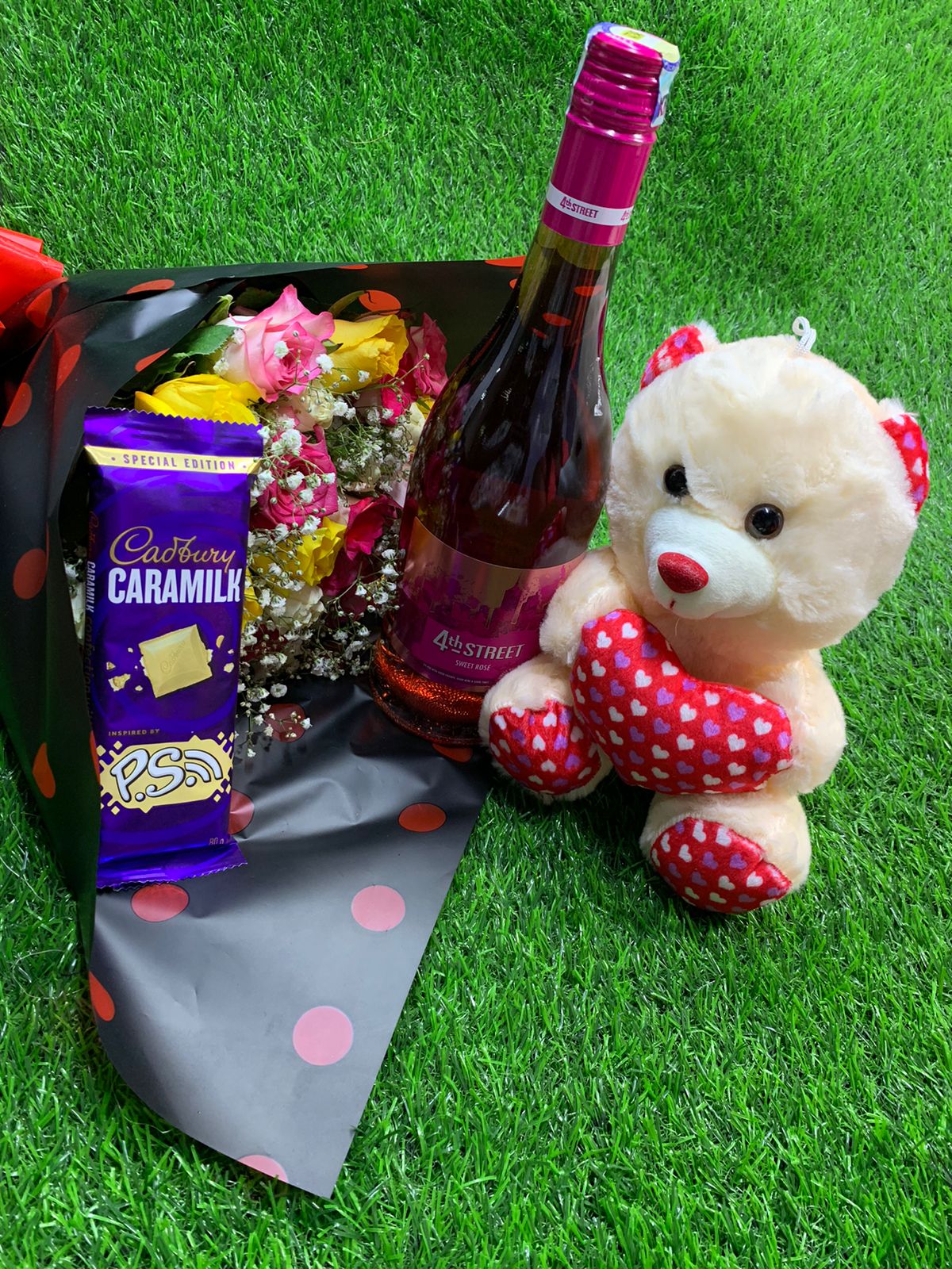 Lovers sensation bouquet and wine valentines gift pack