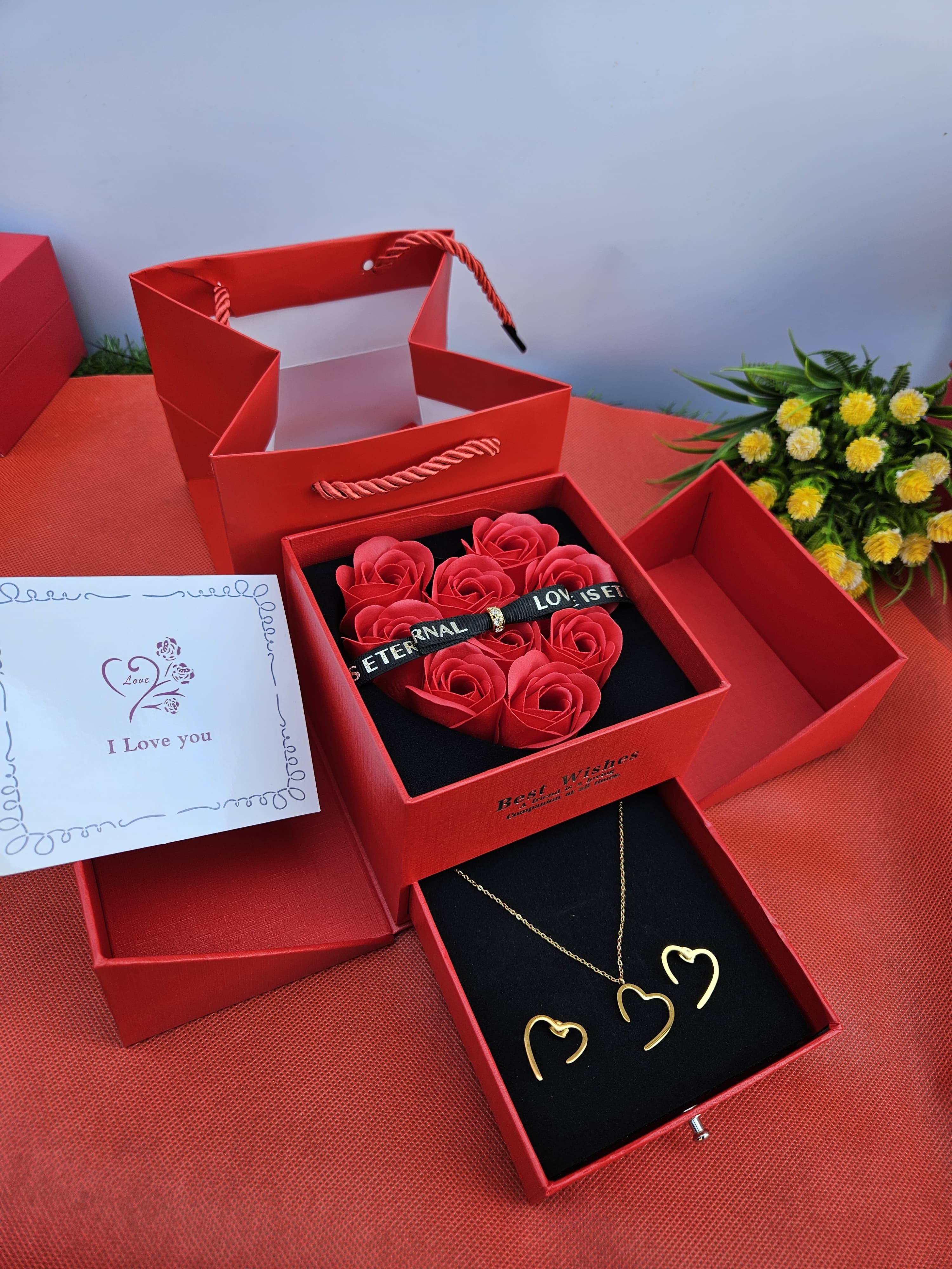 Show your love and appreciation this Valentine's Day with our 💝💕LADIES VALENTINES I LOVE YOU GIFT SET💕💝. This set includes a beautiful stainless steel necklace and earrings, along with preserved roses in a gift box. Plus, a gift bag and card for the perfect presentation. Available in pink and red.