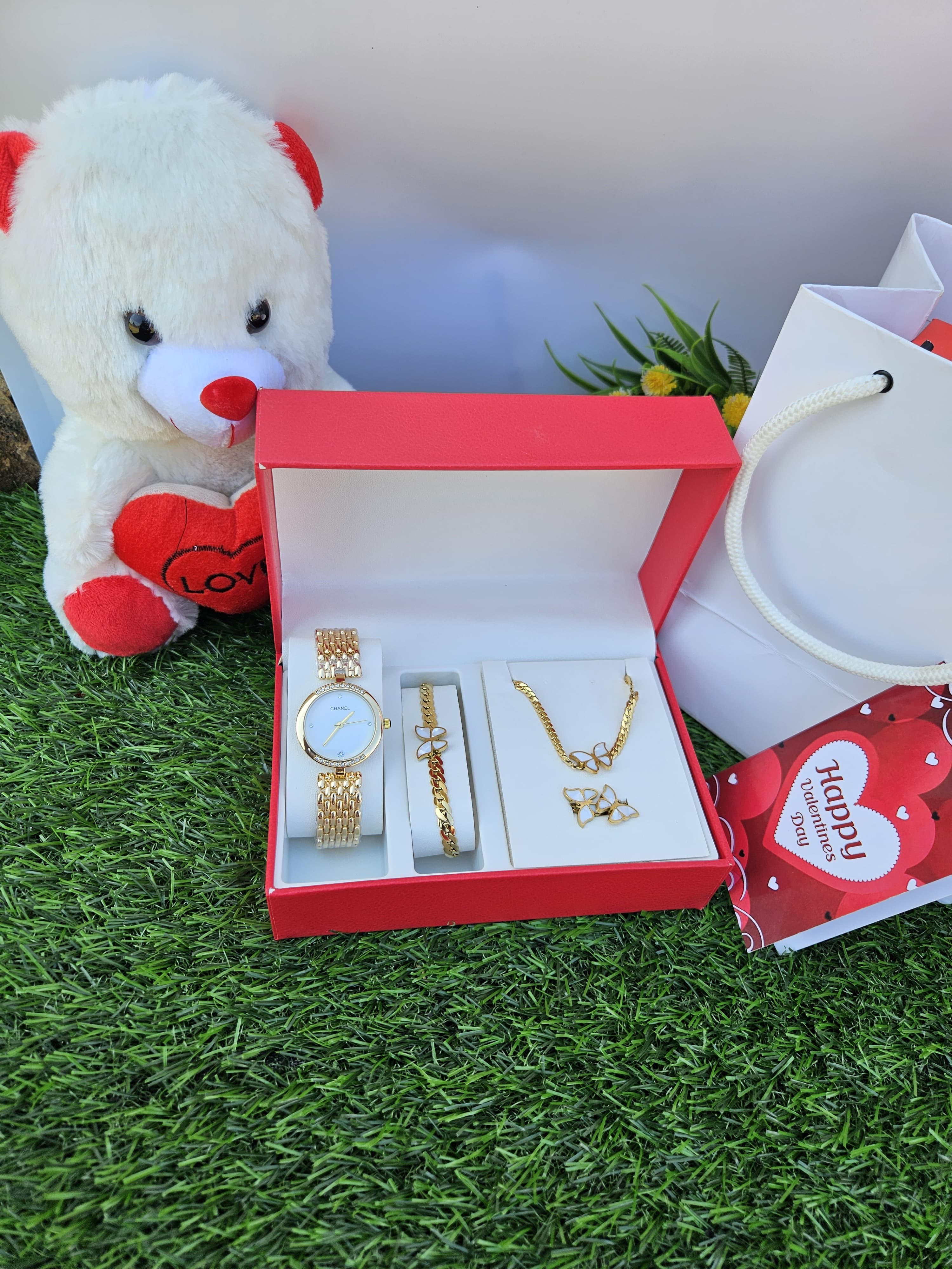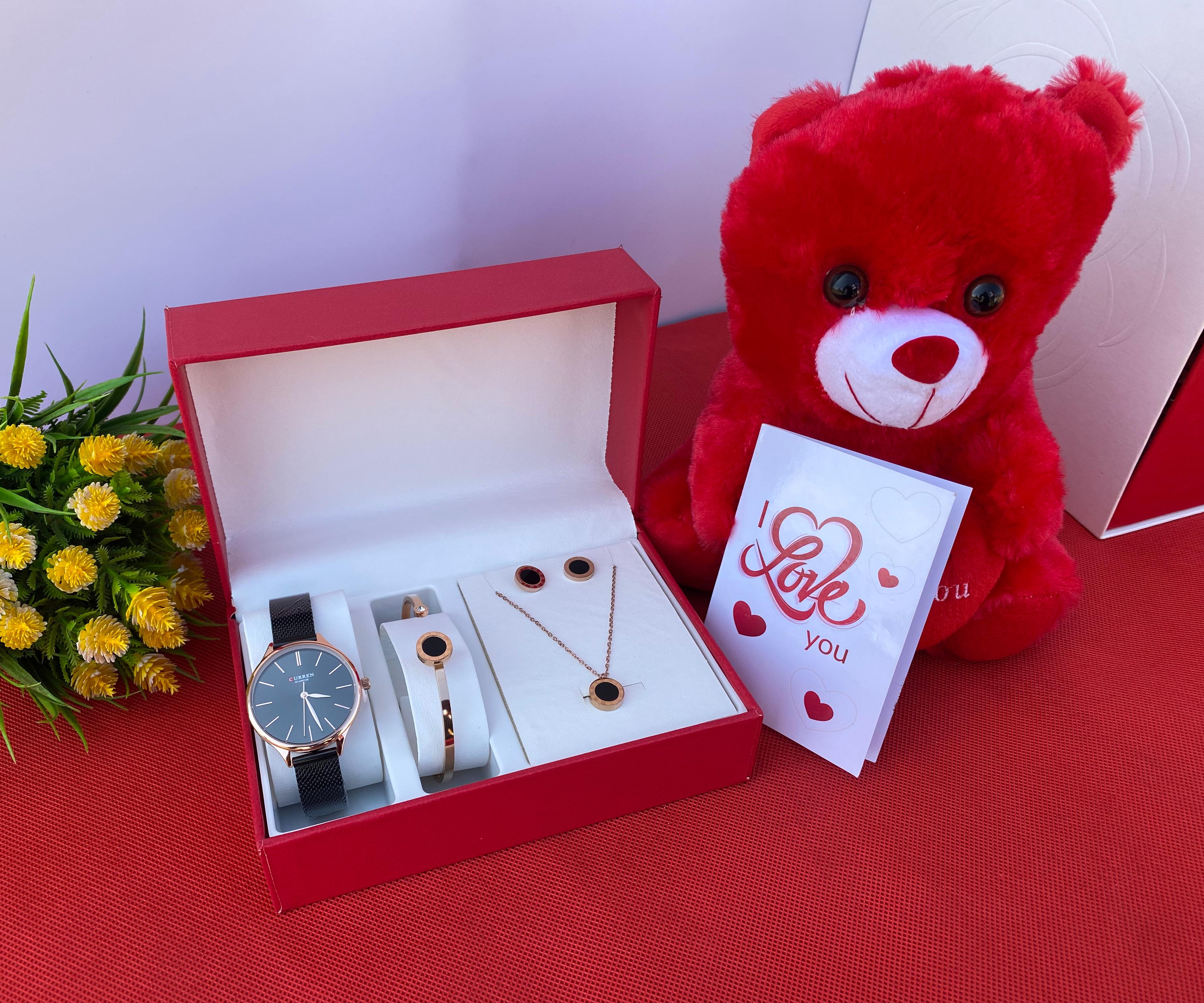 This Valentines 8 in 1 ladies gift pack is the ultimate way to show your love and appreciation. With a cute teddy bear, stylish watch, elegant necklace, trendy bracelet, beautiful earrings, and thoughtful box, giftbag, and card, this pack has everything you need to make her feel special.